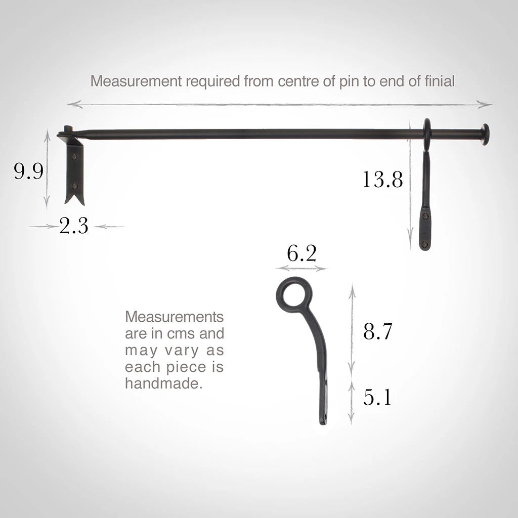 - To ensure your portiere is the correct length, we require the length from the tip of the finial to the centre of the hinge (The hinge is 2cm wide). For help with choosing and measuring your portiere, please read our handy Guide to Portieres in the Jim Lawrence Knowledge Base.