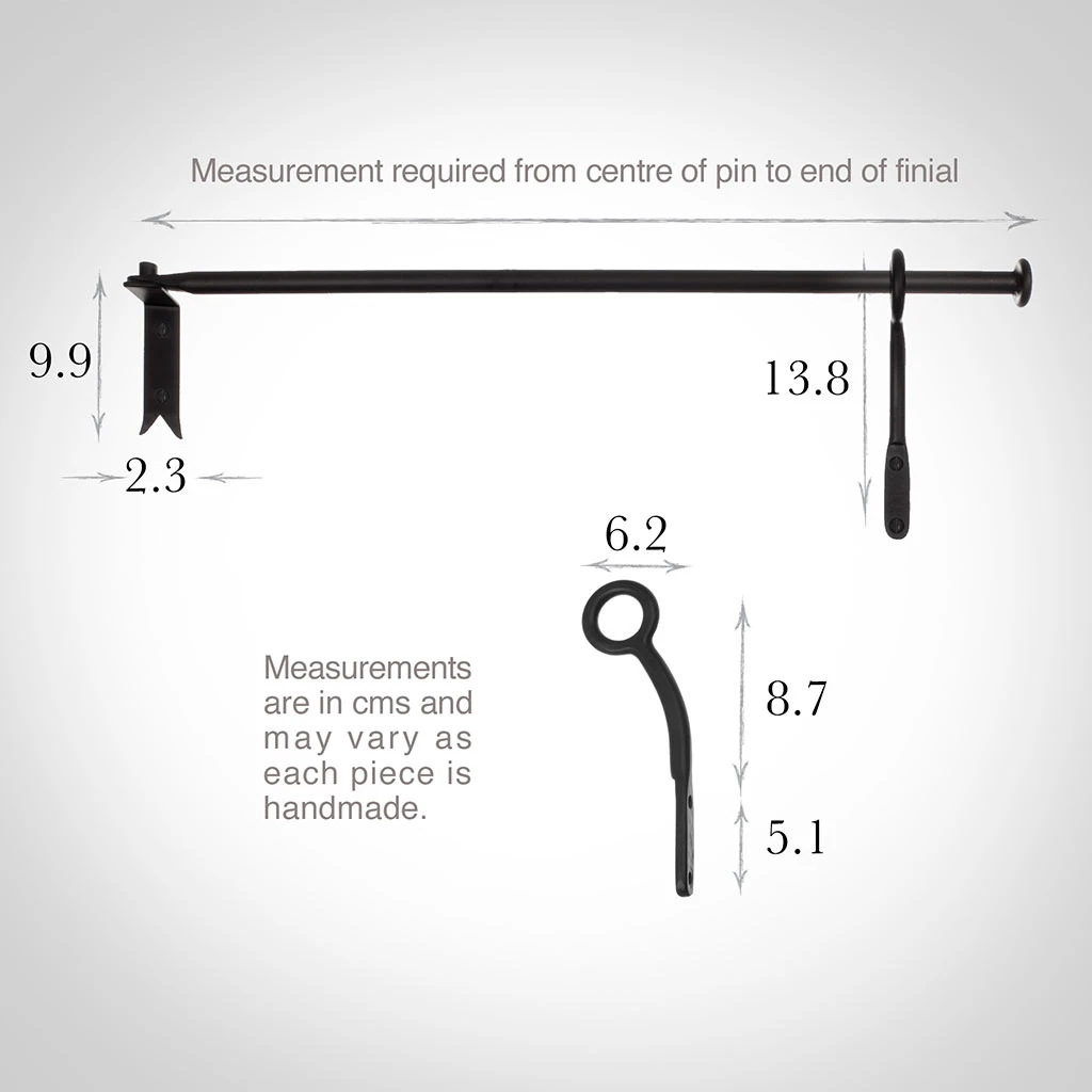 - To ensure your portiere is the correct length, we require the length from the tip of the finial to the centre of the hinge (The hinge is 2cm wide). For help with choosing and measuring your portiere, please read our handy Guide to Portieres in the Jim Lawrence Knowledge Base.