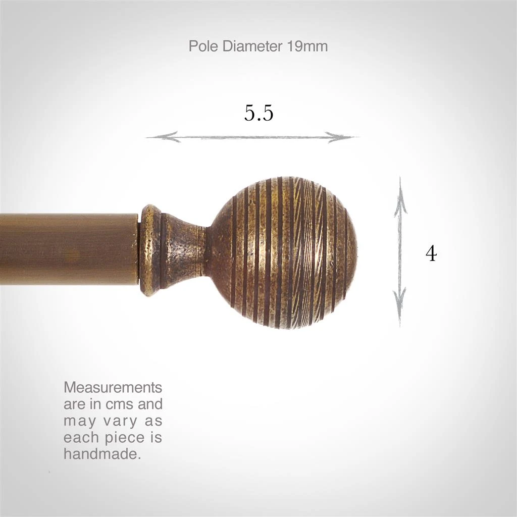 Handmade at Jim Lawrence from natural brass which has been lightly antiqued for a subtle, aged look, these finials from part of our stunning collection of brass curtain pole accessories, including centre and recessed brackets, rings and a wide range of lovely finials to personalise your look. Once fitted inside the pole, the finials can be fixed in place with a tiny grub screw that is located at each end at the back of the pole.