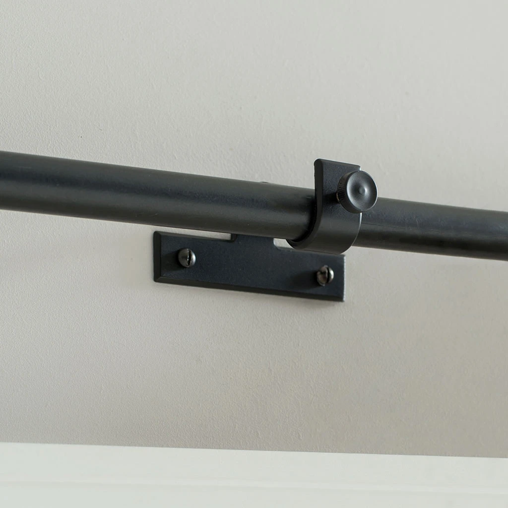Our 20mm Chapel Centre Brackets are the perfect companion for your forged iron curtain poles ensuring they will look fabulous for years to come in whichever room they are fitted. Finished in Matt Black for a smart, uniform finish, these brackets are made from premium quality steel and are suitable for all curtains. We also make a wide range of complementary finials, rings and curtain holdbacks for you to choose from. The brackets have a decorative thumbscrew at the front to help secure your pole, and chamfered edges for an elegant finish.