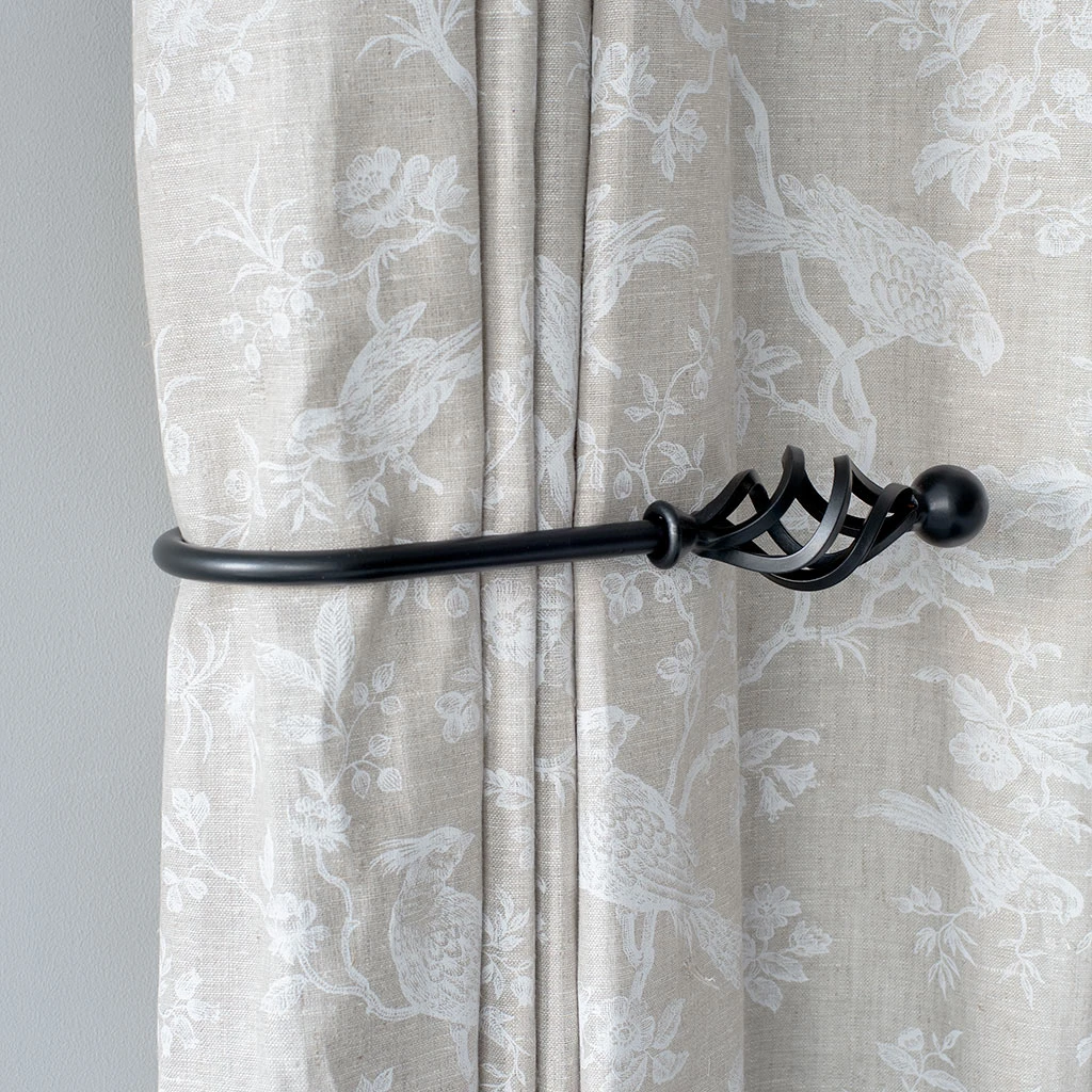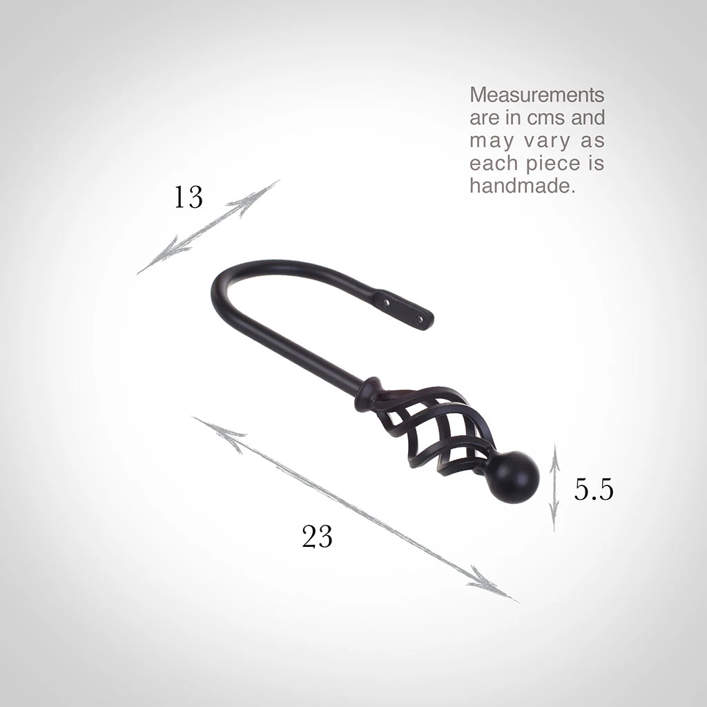 A hand forged, solid steel holdback to match our Cage & Ball finial. The holdbacks are available in two sizes: this larger size is generally recommended where there is more than one width of fabric in the curtain (unless it is a very light, unlined fabric).