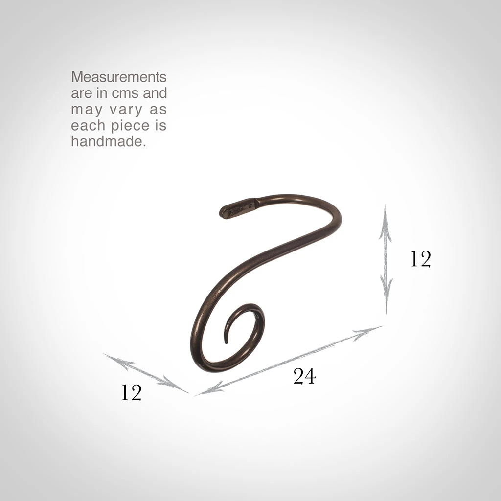 A hand forged, solid steel holdback to match our Crook finial. The holdbacks are available in two sizes: this larger holdback is generally recommended where there is more than one width of fabric in the curtain (unless it is a very light, unlined fabric).