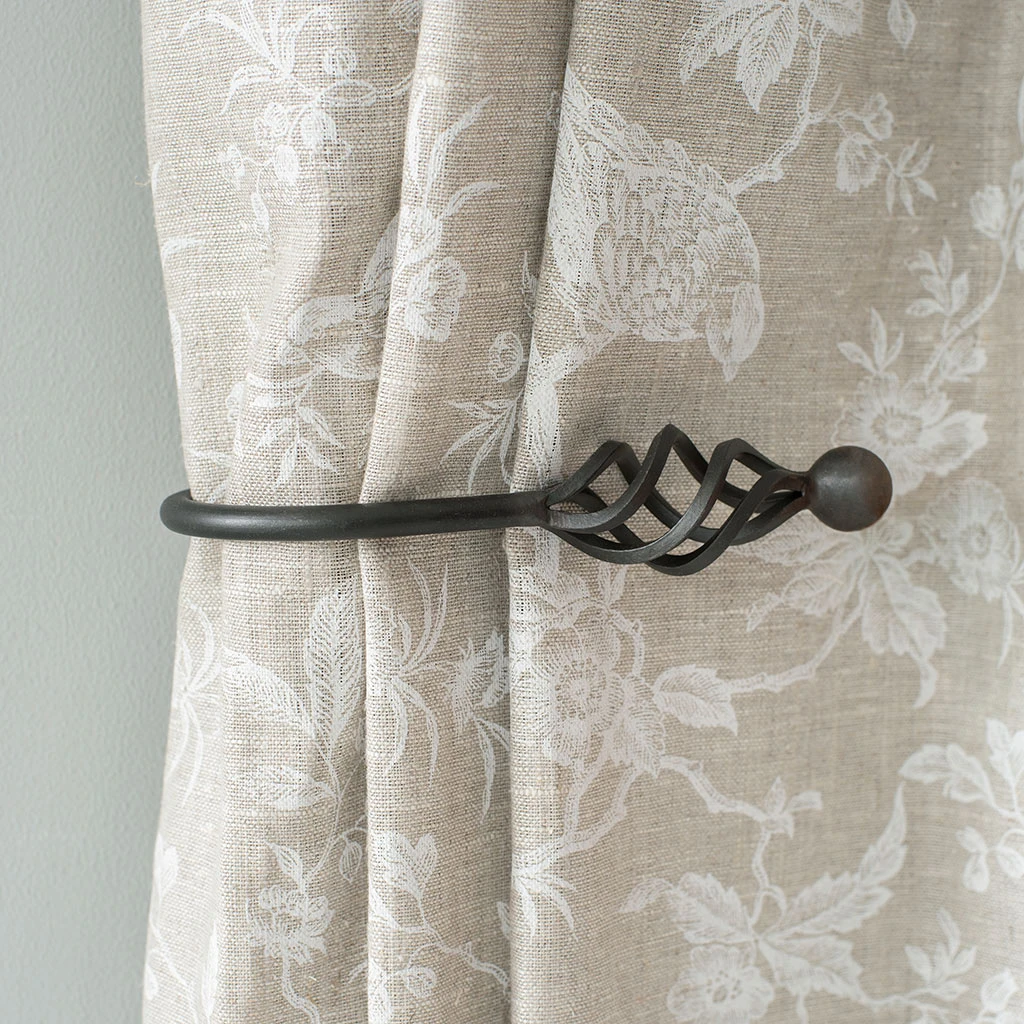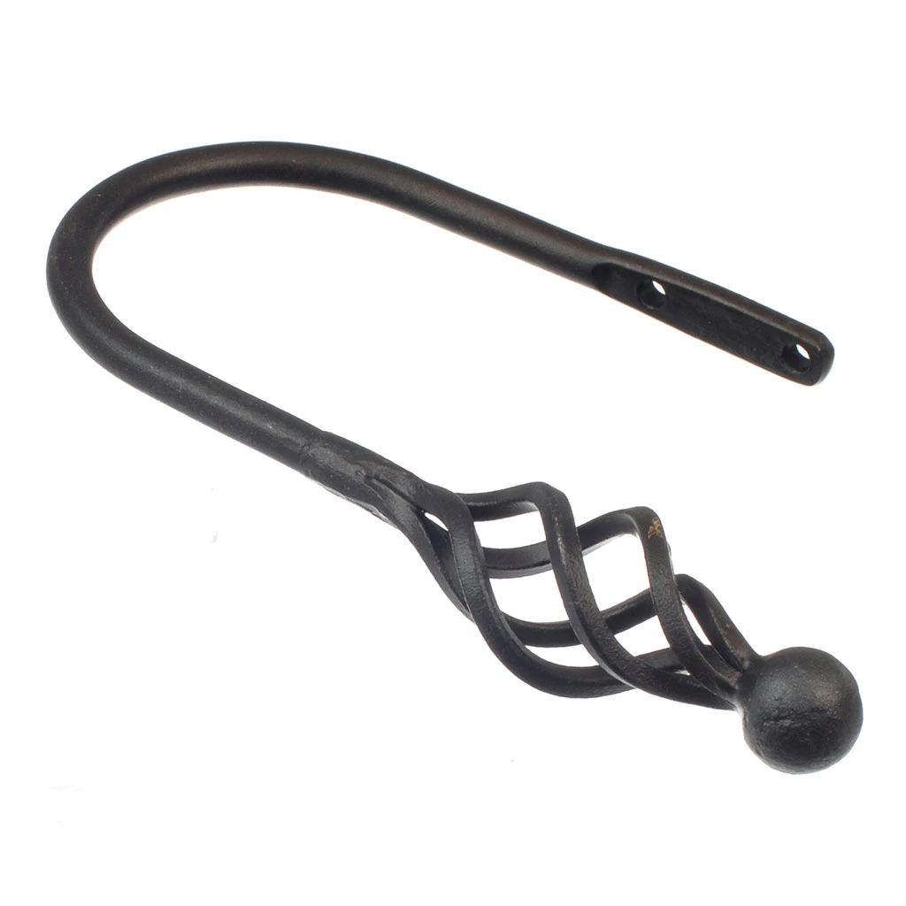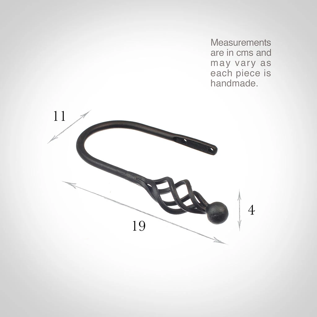 A hand forged, solid steel holdback to match our Cage & Ball finial. The holdbacks are available in two sizes: this smaller holdback is generally recommended where there is only one width of fabric in the curtain (or more if it is a very light, unlined fabric).