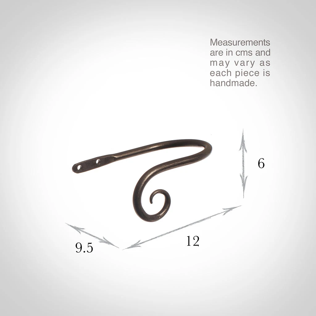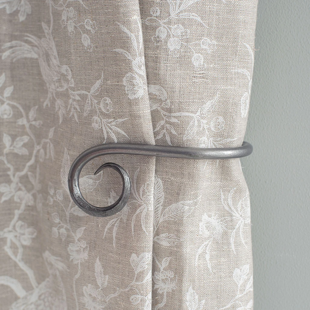 A hand forged, solid steel holdback to match our Crook finial. The holdbacks are available in two sizes: this smaller holdback is generally recommended where there is only one width of fabric in the curtain (or more if it is a very light, unlined fabric).