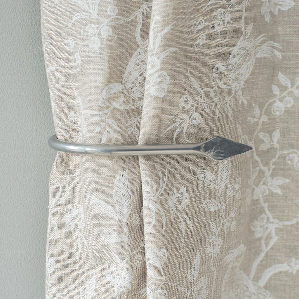 A hand forged, solid steel holdback to match our Spear finial. The holdbacks are available in two sizes: this smaller size is generally recommended where there is only one width of fabric in the curtain (or more if it is a very light, unlined fabric).