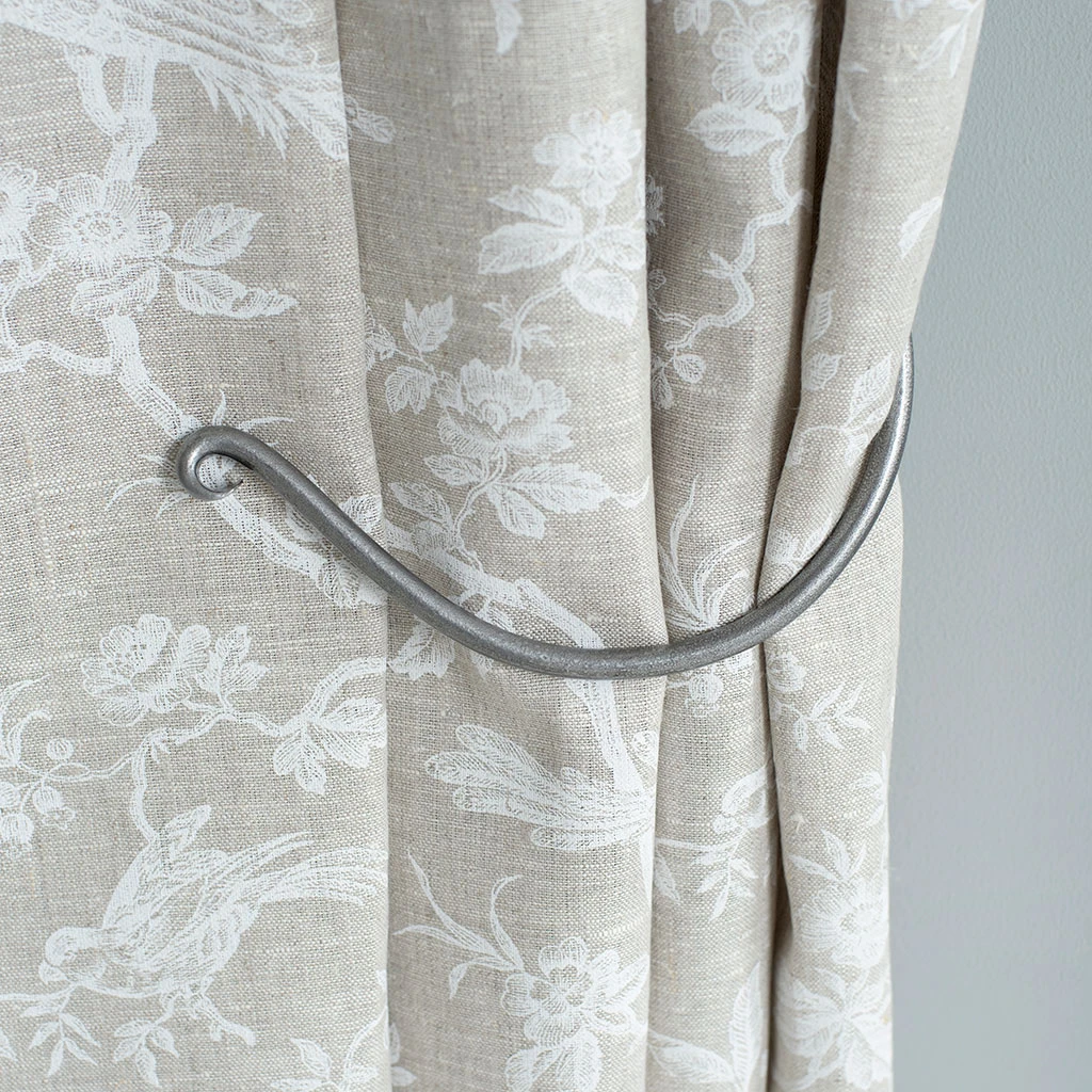 A hand forged holdback which hangs flat against the wall when not in use. The Swing Holdback is available in two sizes and a choice of finishes.